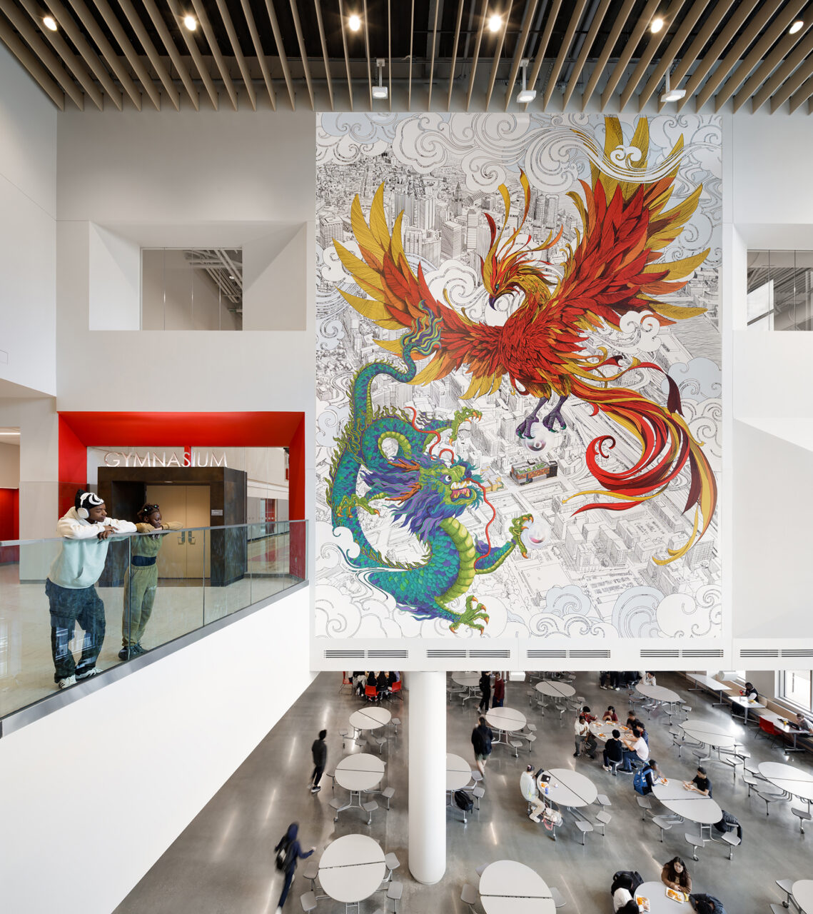 Shared assembly and public spaces including the gymnasium, auditorium, black box theater, and library occupy the first two floors for easy community access. A bridge-like, four-story truss system encases classrooms on the upper floors, allowing them to span over large column-free spaces below.