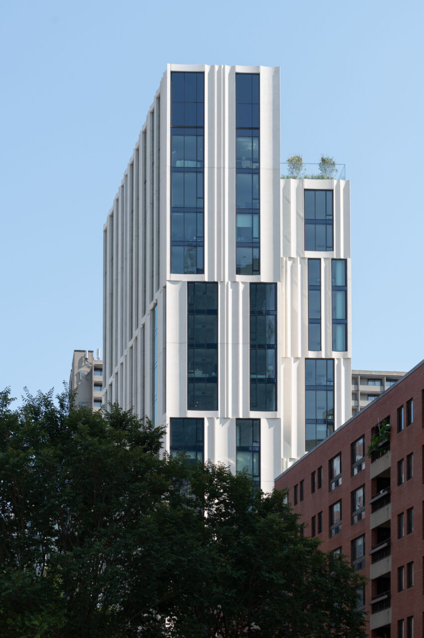 Jury comments: Very nice work with beautiful façade articulation. This tall Boston building reconciles different urban scales with clarity and innovation. The fluted precast façade is technically optimized and visually expressive, creating depth and historic resonance while remaining contemporary. Ground-level townhomes and landscaped thresholds strengthen the pedestrian experience, and social and environmental goals are thoughtfully integrated. Very elegant design solution; interiors could be shown to support.
