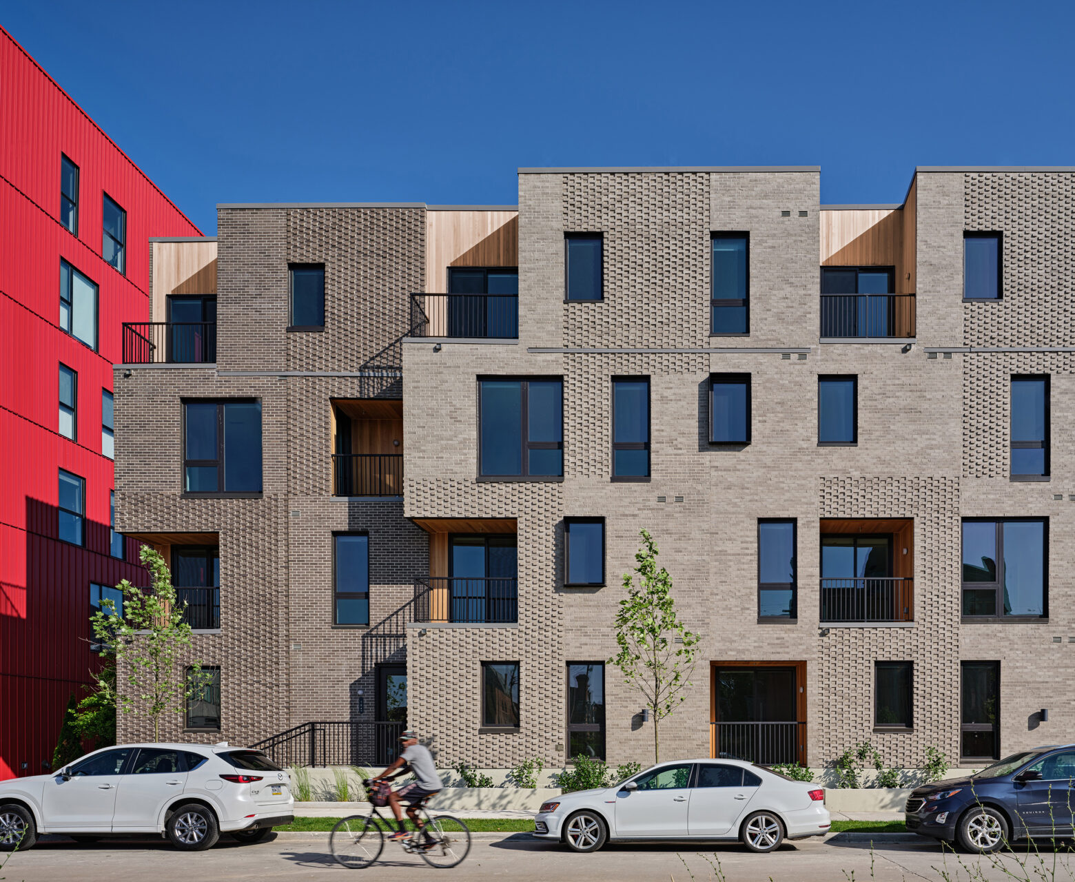 Situated at the neighborhood’s northern edge, D2’s design evolved through historic research, precedent studies, sketches, and 3D modeling. The four-story volume contrasts with adjacent townhomes, while an articulated façade with recessed balconies and window boxes echoes the nearby playful rooftops and enriches the streetscape. Innovation lay in materiality and efficiency. As a fully wood-framed building with full brick veneer, careful detailing managed differential movement. Efficiency was tackled programmatically as well. Larger units are laid out across two levels with an internal stair – a configuration that allows the corridor to be eliminated on the building’s topmost level, giving that square footage back to living space.